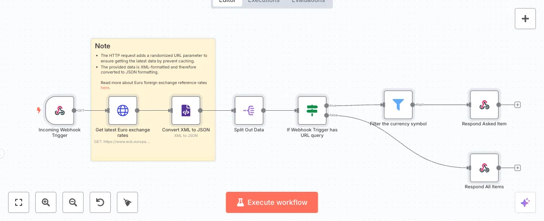 A call to the webhook path triggers a fetch from the official source and appends a random number to bypass caching. The feed is XML, so the flow converts it to JSON and splits it into one item per currency with code and rate. If the URL includes a query like currency=USD, the data is filtered to that symbol and a single result is returned. If no query is present, the full list is sent back. Two response nodes handle both cases so callers always get a clean reply. The webhook waits for the response node before closing the request, so the client receives the freshest data.