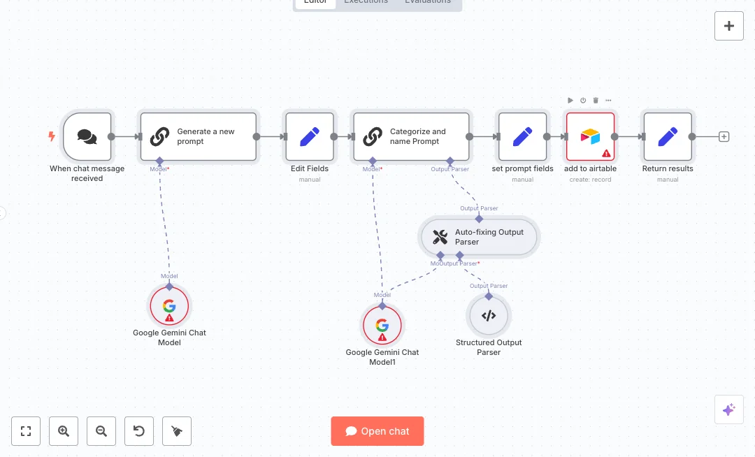 A chat message triggers the flow. Google Gemini writes a new prompt from your input. A second Gemini step reads that prompt and uses a structured parser to return clean JSON with a name and a category. An auto fixing parser repairs small format issues so the record stays valid. Set nodes map fields, then a create step adds the record to your Airtable Prompt Library with Name, Prompt, and Category. The result is also sent back to the chat.