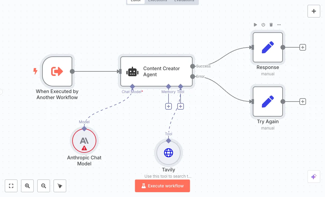 An upstream workflow calls this one and passes a topic as query. The Content Creator Agent uses the Anthropic chat model to write the draft. When the model needs facts, it calls the Tavily search tool, which sends a request to the Tavily API and returns up to three results with raw content. The search runs with basic depth and pulls news sources, so the model can quote and summarize current information. The agent blends that research into the copy and outputs text. A Set node then stores the final draft in a response field, while a second Set node returns a clear error message if something fails.
