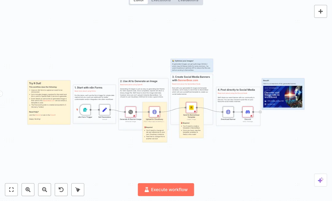 To use this, you need active accounts for OpenAI, Cloudinary, Bannerbear, and a Discord bot with permissions. Create a Bannerbear template and match layer names to the node fields. Set your Cloudinary cloud name and upload preset. Expect faster turnarounds, consistent branding, and fewer handoffs. Ideal for event promos, product updates, and community news where speed and consistency matter.