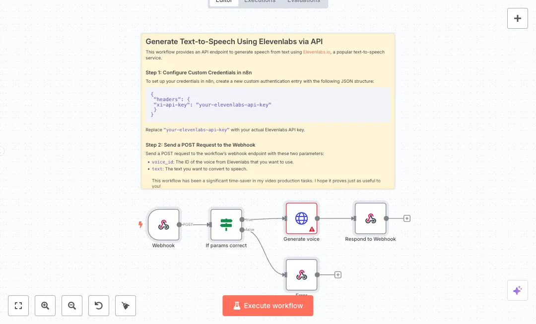 A POST request hits a webhook at the generate voice path. An If check verifies that voice_id and text are present. When valid, an HTTP Request calls the ElevenLabs text to speech API using your API key stored as a header. The audio file that comes back is returned to the caller through Respond to Webhook in binary format, so your app gets the file right away. If inputs are missing, a friendly JSON error is sent instead. This creates a single call service that apps, forms, or scripts can call on demand.