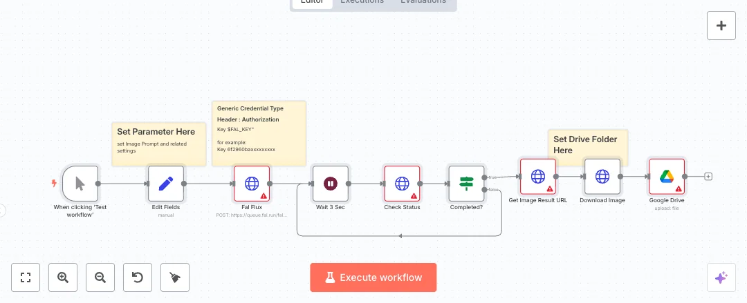 The flow starts with a manual run, then a Set step loads your prompt, size, and quality settings. A request goes to the FAL AI Flux endpoint to start image generation. The system waits a few seconds, checks job status, and loops until it is done. When complete, it grabs the result URL, downloads the first image, and uploads it to your chosen Google Drive folder using the file name returned by the API. The polling loop keeps things reliable and prevents timeouts while the image is being created.