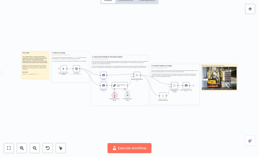 Here is how it works. A manual trigger starts the run and an HTTP Request node downloads an image. The image is resized to 512 by 512 for fast AI processing, and basic image details are read. A Gemini vision model receives the image and returns a structured title and caption using a built in parser. A Code node calculates where the text should go based on the image size. Merge nodes combine the image, the caption, and the positions. Finally, the Edit Image node draws a subtle background box and overlays the title and caption on the image.