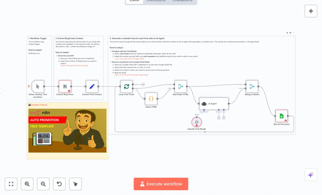 The build pulls recent posts from Ghost, cleans the HTML to plain text, and loops through each article. An AI Agent powered by an OpenAI chat model writes a short LinkedIn message based on the title, link, and cleaned content. Results are merged with the original post data and saved to Google Sheets, including the post ID, title, excerpt, clean content, link, and the AI generated LinkedIn post. This creates one central sheet that your team can edit or move into a scheduling tool.