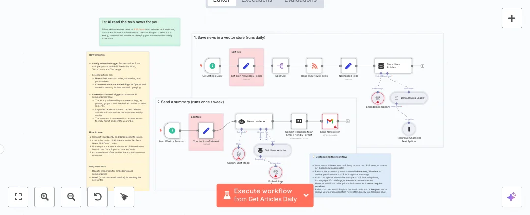 A daily schedule pulls multiple RSS feeds, normalizes the article fields, and turns the text into vectors using OpenAI. Items are held in a vector store so the system can find the most relevant stories later. Once a week, a second schedule reads your topics of interest, uses an AI agent with the vector store to pick last week’s best items, writes a plain English summary, converts it to email friendly HTML, and sends it through Gmail. You get a tidy recap, not a flood of links.