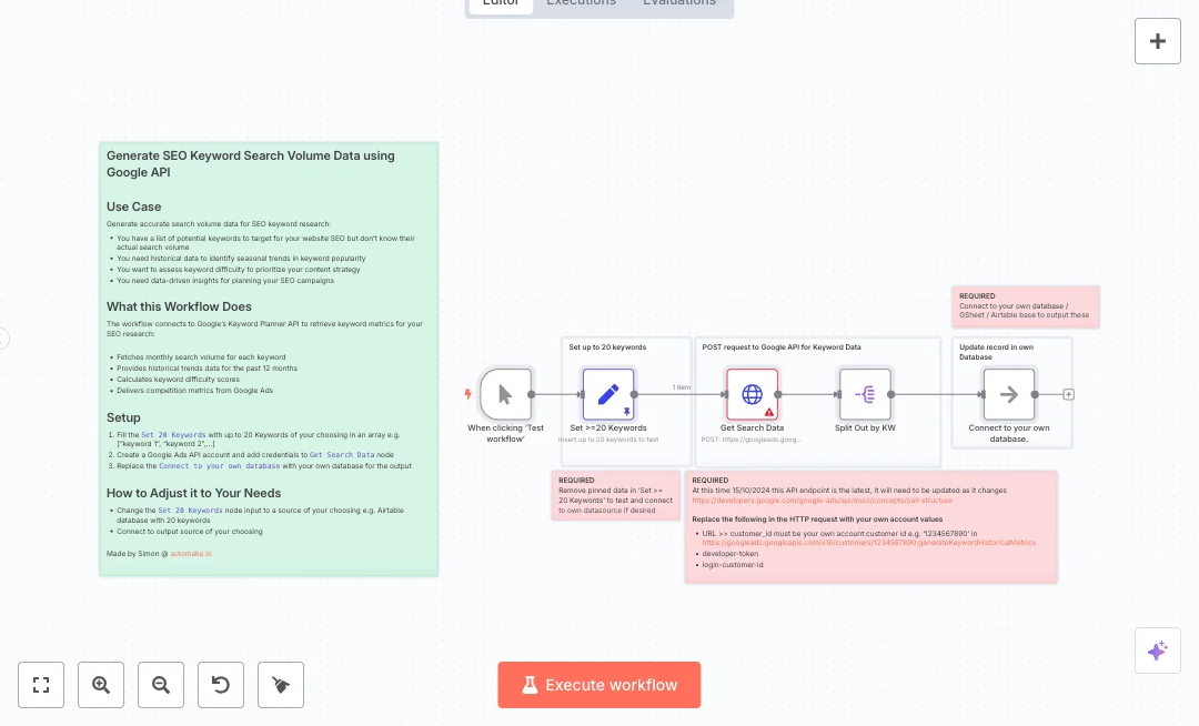 Run it on demand with a manual start. A Set node holds up to 20 keywords. The HTTP Request calls the Google Ads generateKeywordHistoricalMetrics method using your account. Results are split into one item per keyword with the Split Out node, so you can push clean rows into a sheet or database. Using official data helps you pick winners, spot seasonality, and sort priorities fast. The flow is simple and easy to maintain.