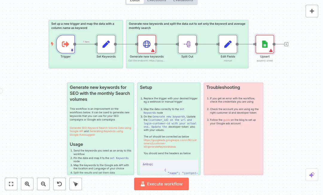 You will need a Google Ads account with API access and a Google Sheets account connected in n8n Cloud. After setup, teams can cut research time from hours to minutes, plan content faster, and keep one source of truth for planning. Use it for weekly SEO sprints, PPC build outs, and topic discovery at scale. Adjust page size to control results and tune geo and language to match your market.