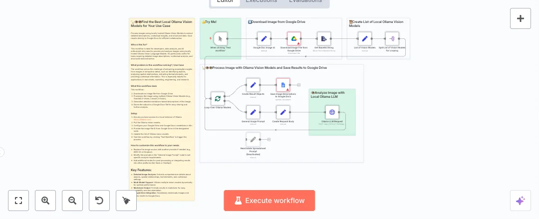 Here is how it works. You start the run manually. The workflow pulls a Google Drive file using its file ID, converts the image to base64, and builds a list of vision models to test. It then loops through each model, sends a structured prompt and the image to your local model server, collects the results, and writes the descriptions into a Google Doc. Two prompt presets are included, one general and one for spreadsheet images, so you can pick the style you need.