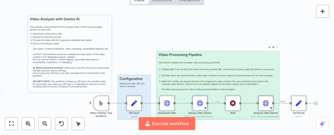 Use a Gemini API key through an environment variable named GeminiKey or with credentials. Expect review time to drop from many minutes to seconds per video while keeping wording consistent across assets. Common uses include content moderation notes, SEO friendly blurbs, and accessibility helper text. You can adjust the prompt to focus on brand safety, product scenes, speaker changes, or on screen text. The output is ready for tagging, catalog search, or sending to a CMS in a follow up workflow.