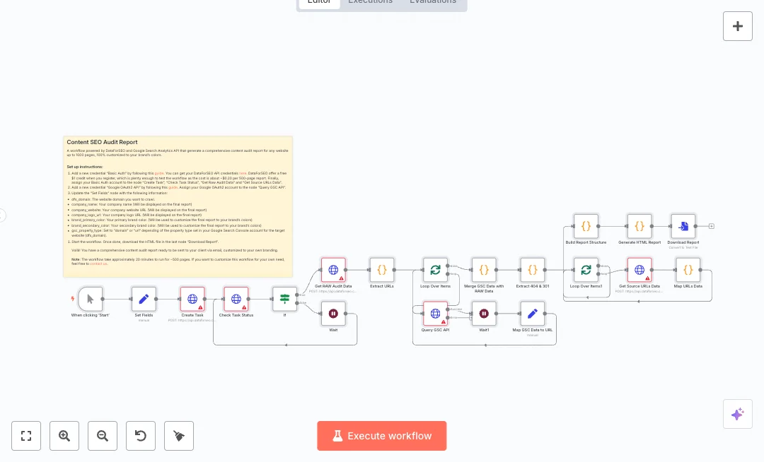 You need a DataForSEO account and Google Search Console access. Update the Set Fields node with your domain, brand colors, and logo, then run and download the file. Expect a clear view of winners and problems, faster audits, and repeatable client reports for onboarding, quarterly checks, and site moves.