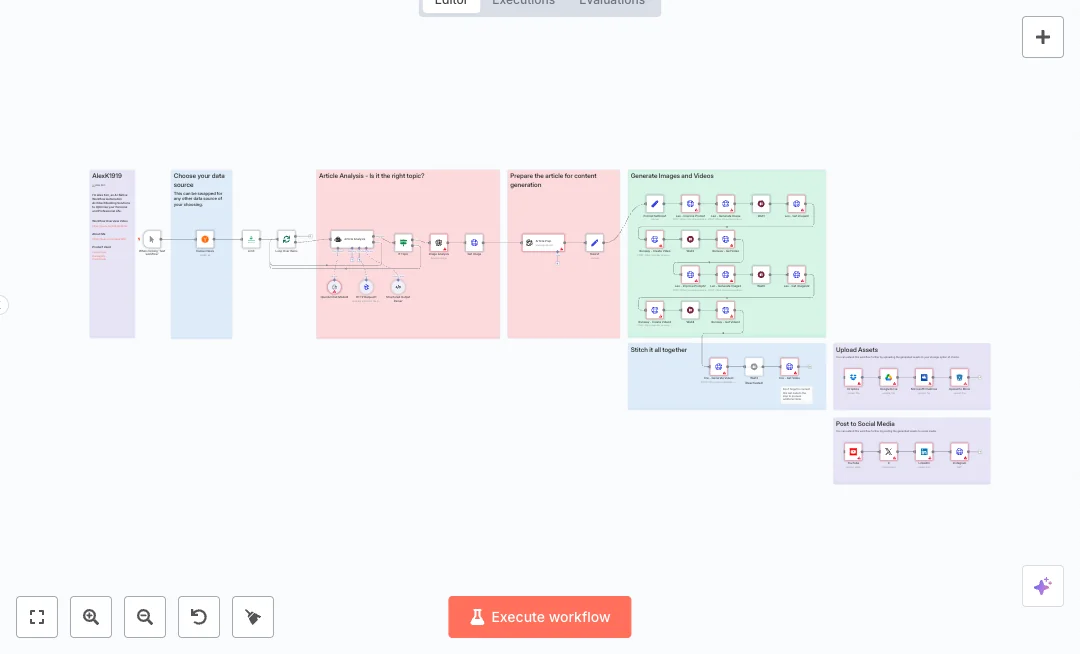 Turn trending tech stories into short videos and social posts with one run. Ideal for marketing teams that want steady content without manual research, editing, and uploading. It pulls news, checks topic fit, builds images and videos, then saves and prepares posts for your channels.