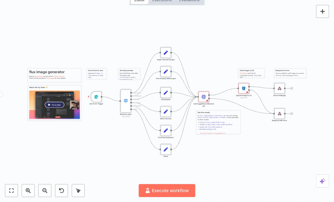 The flow starts with an n8n form that captures the prompt and a style choice. A router sends the request to one of several style presets that set a style prompt. The workflow then calls the Hugging Face inference API to render the image. On success, the image uploads to an S3 bucket with a unique name, and a web page returns the final image and link. If the API fails, a clear error message is sent back to the form. You can swap the model in the API URL and point S3 to AWS or an S3 compatible service like R2.