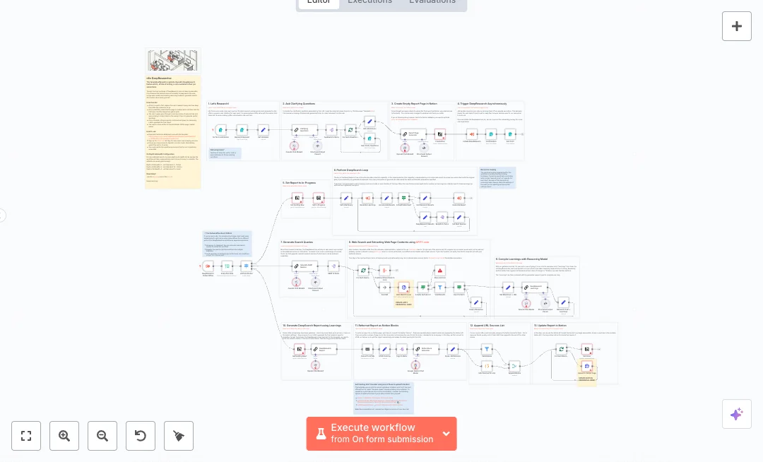 A form trigger starts the flow, then AI creates search queries and follow up questions. The system launches an async subworkflow that loops through AI generated queries, scrapes sources with Apify, and compiles learnings using a reasoning model. Depth and breadth settings control how many rounds and sources are explored, so you can switch from quick checks to deep dives. Results are turned into markdown, converted into Notion blocks, and written to a Notion page. An auth check handles Apify token errors and an empty content path prevents bad uploads.