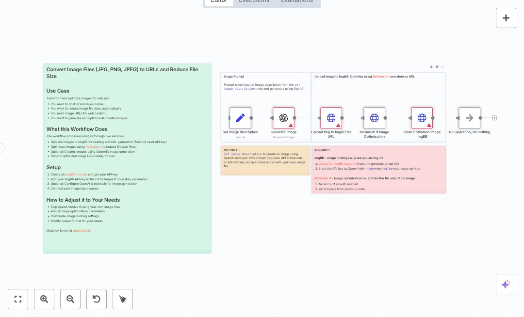 The flow can create an image from a short prompt using OpenAI, then uploads that file to ImgBB to get a link. Next it sends the hosted image to ReSmush.it to reduce file size. The optimized version is then saved back to ImgBB so you get a final, stable URL to use anywhere. You can also skip the AI step and feed in your own image file. The end result is a clean public link with a smaller file size.