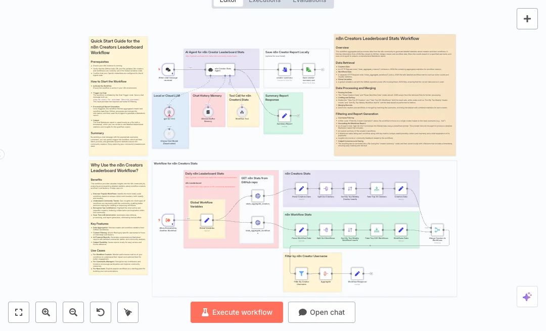 It listens for a chat message or a call from another workflow. Global settings point to JSON files. HTTP steps pull creator and workflow data, then the flow splits, sorts, and limits records to focus on top creators and popular workflows. A smart agent uses OpenAI to write a readable report for a single username or a top list summary. The file is saved with a time stamped name and the response is also returned to chat.