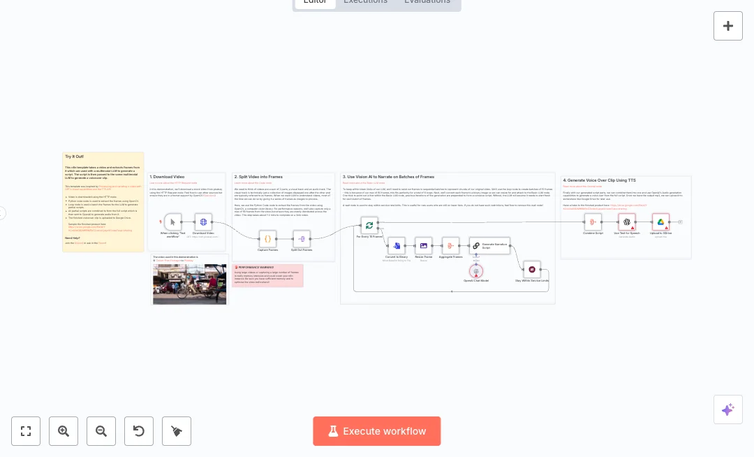 Here is how it works. A manual run starts an HTTP download of the video. A Python step uses OpenCV to capture up to 90 evenly spaced frames. Frames are split into groups of 15, converted to images, resized, and sent to an OpenAI chat model to write short parts of the script. Earlier outputs are included, so the story flows across batches. A wait step avoids rate limits. All partial texts are combined and sent to OpenAI text to speech to create a single MP3, then saved to Google Drive.