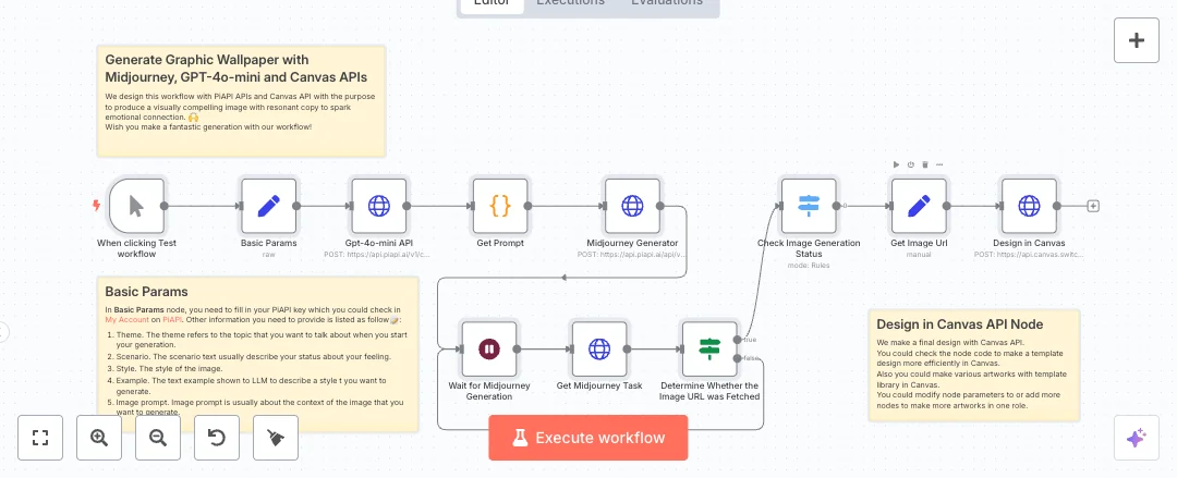 Here is how it runs. You start it manually and set basic fields like theme, scenario, style, example, image prompt, and your API key. A chat model call through PiAPI writes the copy. A code step merges that copy into an image prompt. A Midjourney task is created via PiAPI, then a wait step pauses until the image is ready. The flow checks task status and, when complete, pulls the image URL. Finally, a Canvas API call places the text and the image into a fixed template and returns a ready to share graphic.