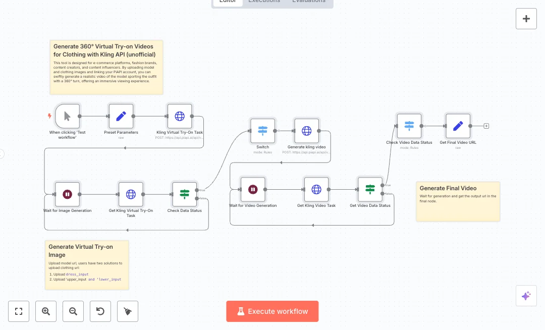 The run starts with a manual test. A parameters node stores your API key, model image link, and clothing links for either a full dress or upper and lower pieces. An HTTP call creates a try on task in PiAPI. A wait and poll loop checks task status until the image is done. If checks and switch logic route success or retry. The next HTTP call generates a video from the produced image using a prompt like walk on the catwalk. Another wait and poll loop follows until the video is ready. A final node extracts the video link for download and sharing.
