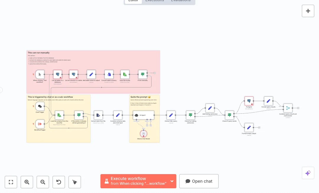 There are two parts. A manual path scans your database, lists all tables and columns, then saves a compact schema file for later use. The chat path loads that schema, combines it with the user message and session id, and sends it to a local language model through an AI Agent. A parser pulls the SELECT query from the model output, adds a missing semicolon if needed, and only runs the query when it passes the check. The system executes the SQL on PostgreSQL, formats a readable table, and merges it with the AI explanation. It accepts messages from a chat webhook, a manual test, or as a sub workflow input. If no valid query is found, it returns a friendly empty result instead of failing.