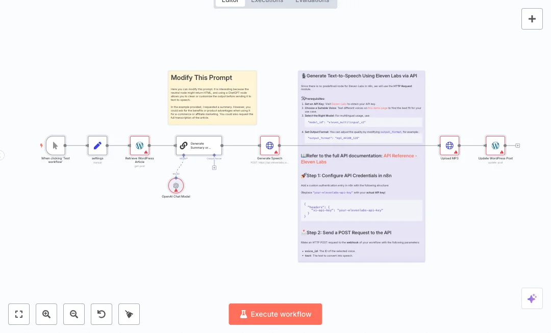 To set this up, you need accounts for WordPress, OpenAI, and ElevenLabs along with API access. Set your site URL, replace the voice ID, and confirm the HTTP request returns binary data named data. Expect faster publishing, less manual work, and more accessible posts. It fits blogs, news sites, or product pages that want a quick listen option.