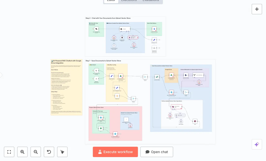 The system starts from a manual button, a webhook call, or a chat message. It looks up file IDs in Google Drive, downloads content, and extracts key details like main themes and topics. Text is split into smart chunks and turned into embeddings with OpenAI. Those chunks and metadata are stored in Qdrant for hybrid search. A chat agent then uses Qdrant to find the right passages and forms a clear reply using OpenAI or Google Gemini. Chat history is saved to Google Docs. A Telegram approval step protects your data when deleting items from the vector store.
