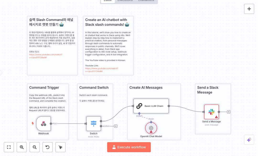 When someone triggers a slash command, Slack sends the text to an n8n webhook. The webhook confirms the request with a 204 response so Slack does not wait. A Switch node routes each command, so you can support different actions. The Basic LLM Chain passes the message text to the OpenAI Chat Model and returns a clean answer. The Slack node then posts that answer back into the original channel using the channel id from the request. You can add more branches to handle extra commands like summarize or translate.
