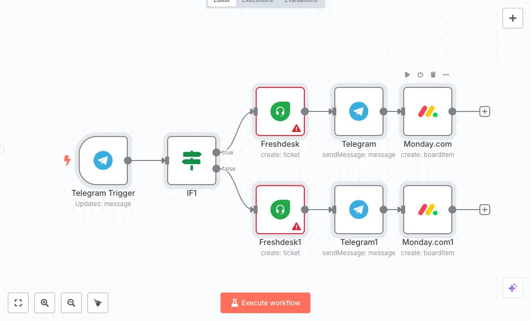 You will need a Telegram bot, a Freshdesk API key, and a Monday.com API token, plus a board and group IDs ready. Expect faster first responses and less manual sorting. Great for brands that sell through chat, community managers, or any team that wants a simple keyword rule to triage refund requests from general complaints.