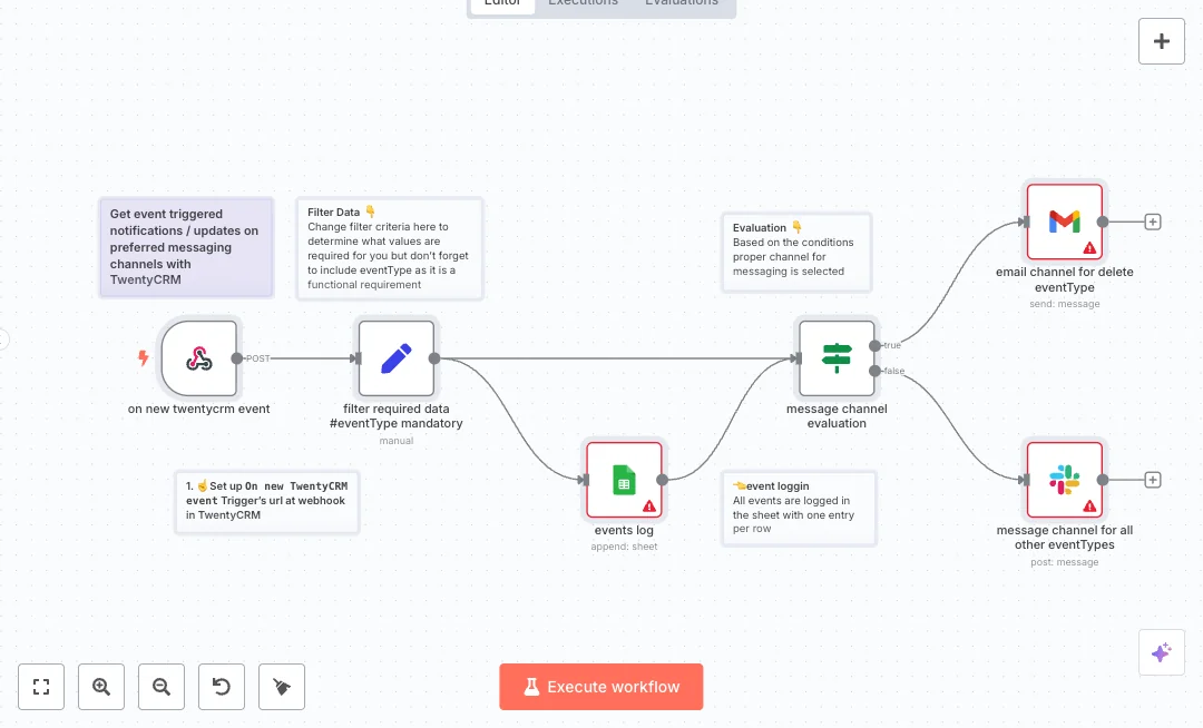Get instant updates from your CRM and keep a clear audit trail. New events from TwentyCRM are captured, logged to a Google Sheets log, and sent to the right channel so your team acts fast. Use this for sales activity, record changes, and data cleanup alerts.