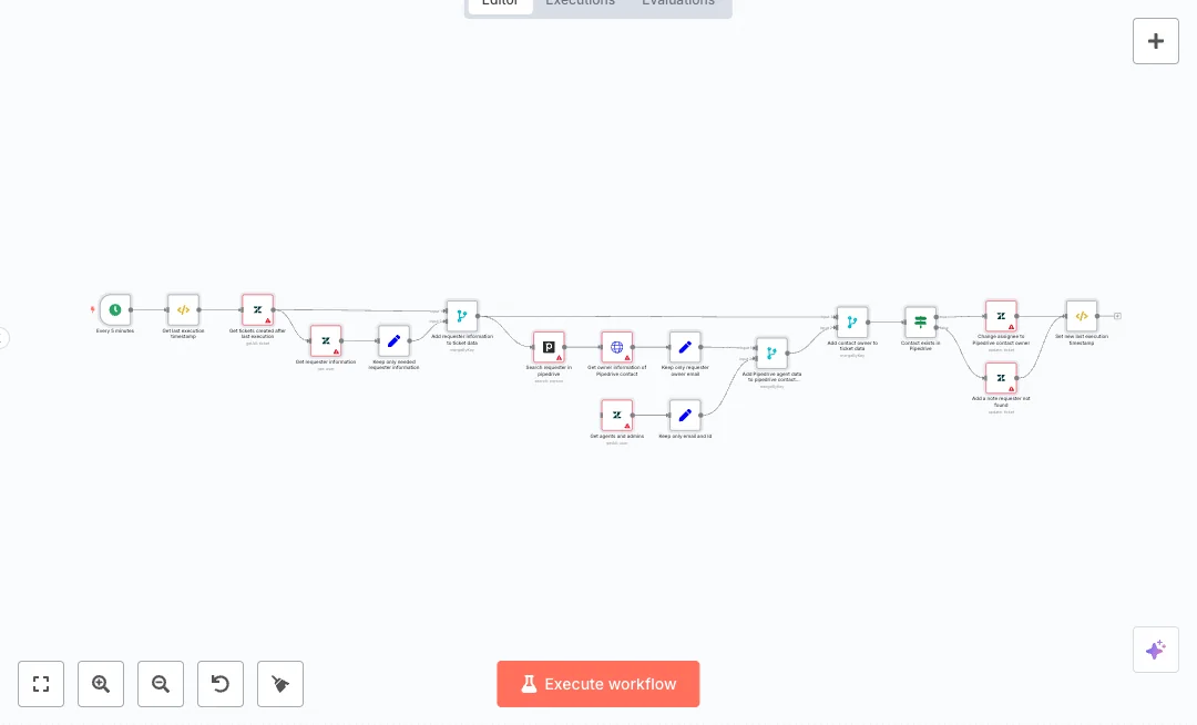 A schedule runs every five minutes and reads the last run time to pull only new Zendesk tickets. For each ticket, the requester email is looked up in Pipedrive to find the person and their owner, and the owner profile is fetched from the Pipedrive users endpoint. The flow also loads all Zendesk agents and admins and then matches the Pipedrive owner email with a Zendesk user email to identify the right assignee. If no match is found or the person does not exist in Pipedrive, a clear note is added so the team can follow up fast.