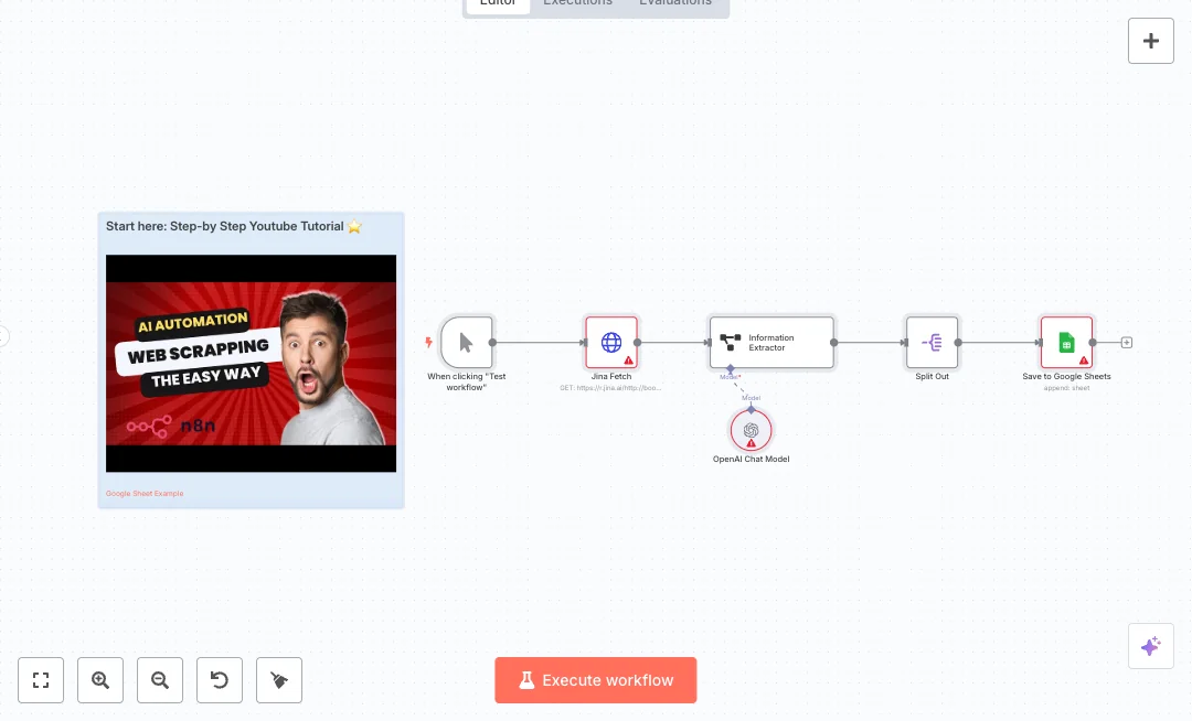 The flow starts with a manual run, fetches a web page with an HTTP Request, and sends the page text into an AI extractor. The extractor uses a chat model to pull fields like title and price into a clean results list. The Split Out node handles each product as its own item, then the Google Sheets node appends each row to your chosen sheet. No need to write parsers or selectors.