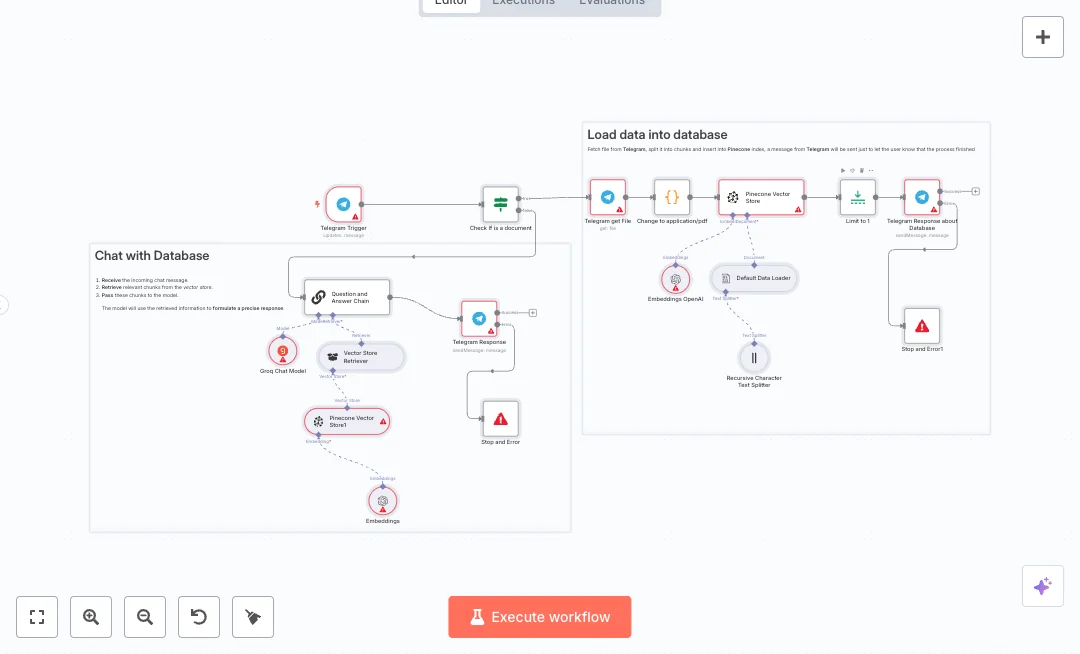 When a Telegram message arrives, the flow checks if it is a document or a question. For documents, the bot downloads the file, tags it as a PDF, splits it into small parts, creates vector embeddings with OpenAI, and saves them in a Pinecone index. A reply confirms how many pages were stored. For questions, the flow searches Pinecone for the best chunks, sends them to a Groq large language model, and returns a focused answer back to the same chat. This keeps answers grounded in your files and reduces guesswork.