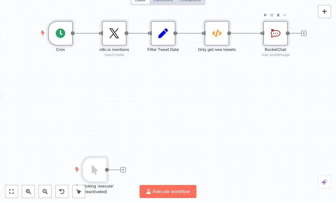 A one minute schedule starts a Twitter search for your handle or keyword. The flow keeps only tweet text, id, and a link so messages stay clear and useful. A memory step compares tweet ids and sends forward only new items to prevent repeats. The message in RocketChat includes the tweet content and a direct link so the team can act right away. You can also run a quick manual test before turning on the schedule.