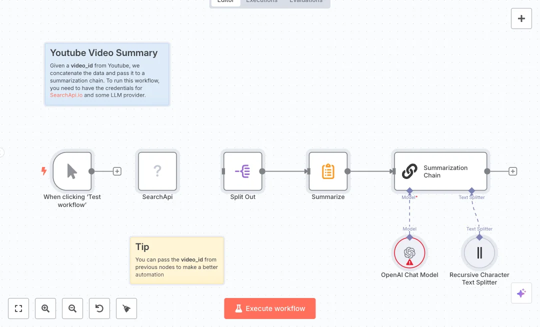 You need API keys for SearchApi.io and OpenAI. Add the video id or map it from an earlier step, then run a test to see the output. Teams can turn the result into show notes, article outlines, or social copy and cut review time from hours to minutes. Keep the chunk size at 6000 for long videos, or adjust if your model has lower limits.