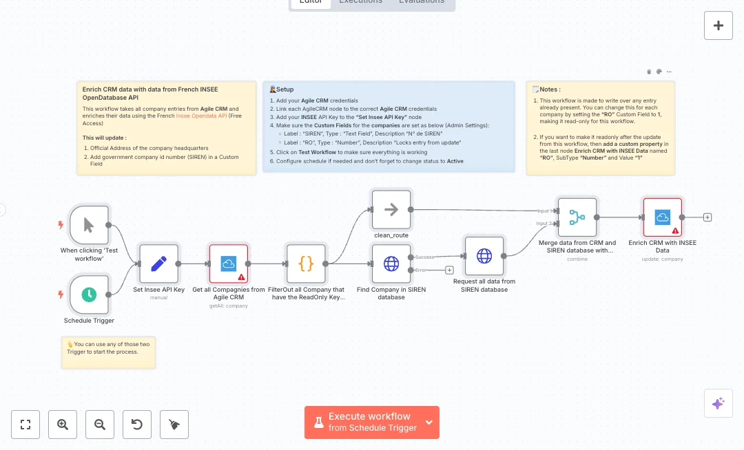 Here is how it runs. You can start it by hand or on a schedule. It pulls all companies from Agile CRM, then skips any record marked as read only using the RO field. For the rest, it searches the French INSEE Sirene API by company name, fetches the full record, and merges it with CRM data. It then updates each company in Agile CRM with the official head office address and saves the SIREN number in a custom field. The RO flag protects records you do not want to change.