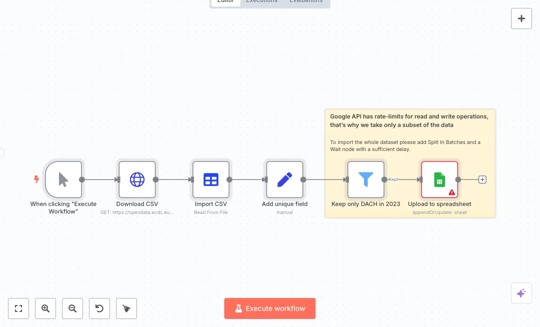 After you click run, the flow downloads a live CSV from a public data source. It reads the file, creates a unique key from country code and week, and keeps only DACH rows for 2023. It then writes data to a chosen sheet using append or update, so new weeks are added and existing weeks are updated without duplicates. The Google Sheets node uses user entered cell format to keep values readable in the sheet. The result is a reliable view for weekly monitoring and simple sharing.