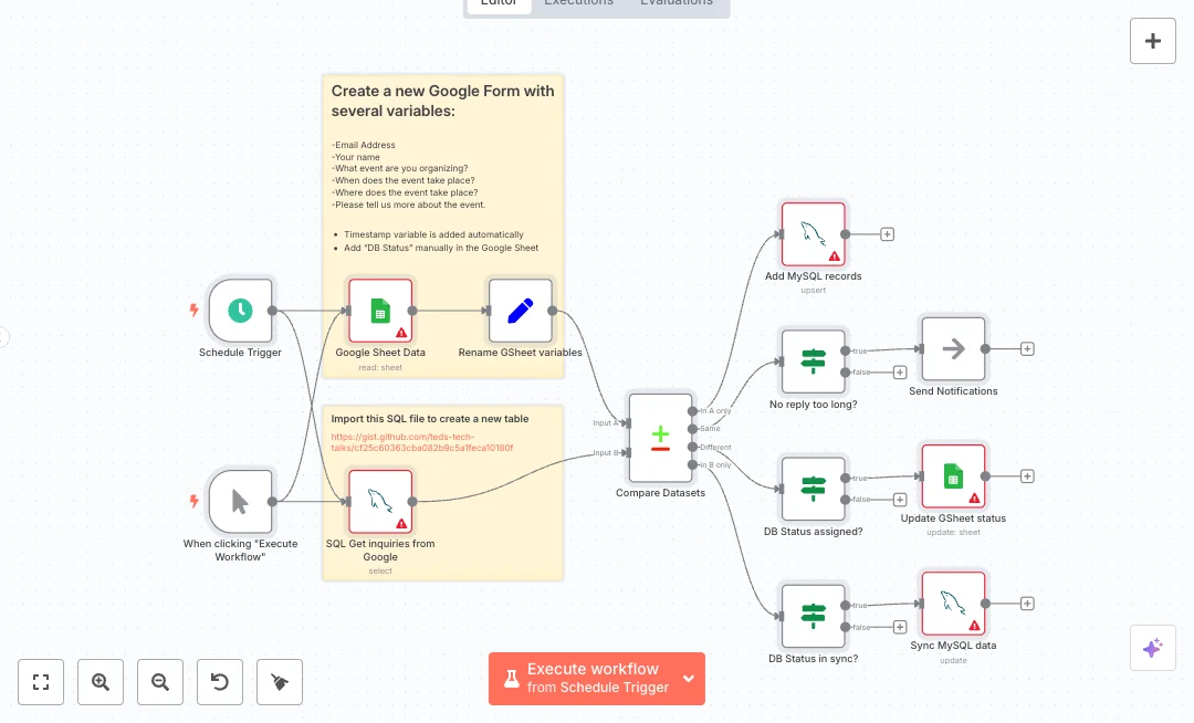 Turn Google Form entries into a clean lead database without copy and paste. The flow reads a Google Sheet, writes new leads into MySQL, and flags items that need a fast reply. It fits teams that manage event inquiries or bookings.