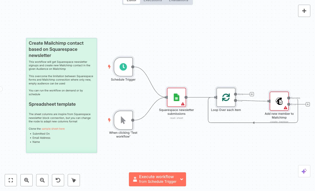 Setup is simple. Connect Google Sheets and Mailchimp credentials in n8n and pick your audience. Map Email Address, Name, and Submitted On to the right fields. Set a schedule that fits your intake pace. Expect fewer errors, faster updates, and less time spent exporting and importing files. Great for sites where Squarespace or similar tools send form data to Google Sheets.