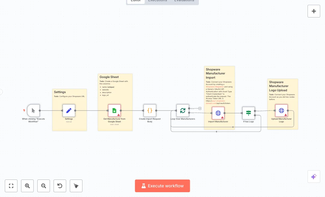 Start it with a click. A Settings step stores your Shopware URL and language code. The Google Sheets step reads rows with name, website, description, and logo_url. A Code step builds a Shopware sync request and creates stable media ids using an md5 hash. Split In Batches sends each record to the Shopware sync endpoint to create or update the manufacturer. An If check looks for a logo link and, when present, uploads the image to the right media id with the correct file name and extension. The loop continues until every row is processed.