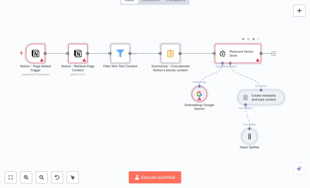 A Notion event checks a chosen database every minute. When a page is added, the content is pulled and non text blocks are filtered out. The text is joined into one clean field, then split into 256 token chunks with a 30 token overlap to keep context between parts. Each page gets metadata like page ID and timestamps. Google Gemini creates embeddings from the chunks and Pinecone stores them in the selected index. This keeps your index fresh, clean, and easy to search with vectors.