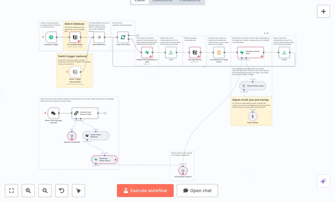 Here is how it runs end to end. A Notion event or a one minute schedule finds pages that were just edited in your Knowledge Base. Each page is processed one by one to avoid double work. Old vectors for that page are removed from Supabase first, so stale answers do not appear. The page content and nested blocks are pulled, merged into one clean text, then split into 500 token chunks with adjustable overlap for better search. OpenAI creates embeddings for each chunk and stores them in a Supabase vector table with the page id and name. A public chat endpoint receives questions and uses a vector retriever plus an OpenAI chat model to return focused answers based on the most relevant chunks.