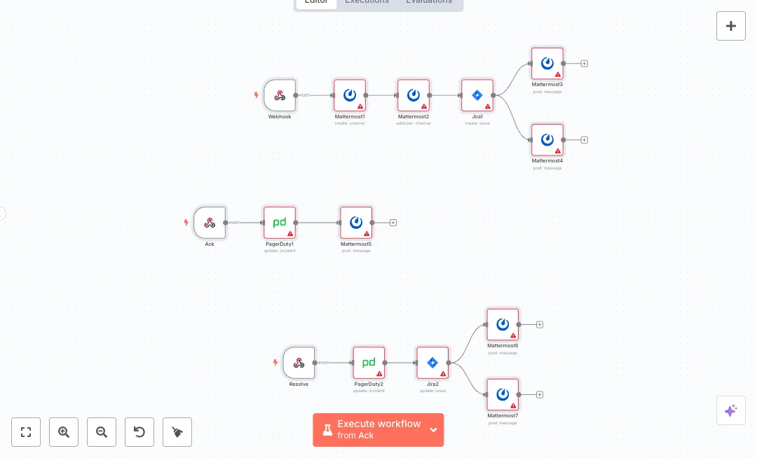 Three webhooks drive the flow. The main webhook receives PagerDuty payloads and sends two Mattermost messages with the incident summary and link, then creates a Jira ticket in the right project and type with a set assignee. A second webhook handles acknowledge requests, sets the PagerDuty incident to acknowledged, and posts a confirmation to the same Mattermost channel using the channel_id in the request. The third webhook handles resolve, marks the PagerDuty incident as resolved, updates the Jira issue to a closed status, and notifies the channel. The acknowledge and resolve endpoints expect the PagerDuty incident ID and the Jira key in the request body, which can be sent by a Mattermost slash command or button.
