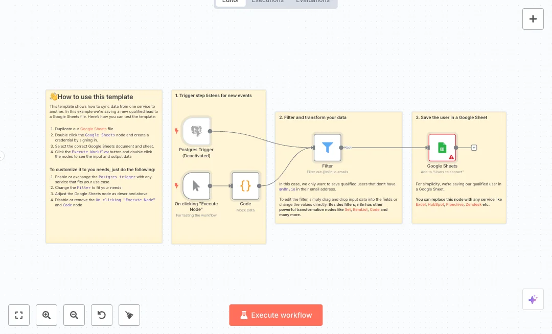A Postgres Trigger watches the users table for updates and sends the row forward. A Filter then blocks emails that include a specific domain so internal users do not crowd your list. For testing, a Manual Trigger runs a Code node that outputs sample data. Valid records flow to Google Sheets using append or update so the sheet stays current without manual work. Fields map to id, email, and username for easy tracking.