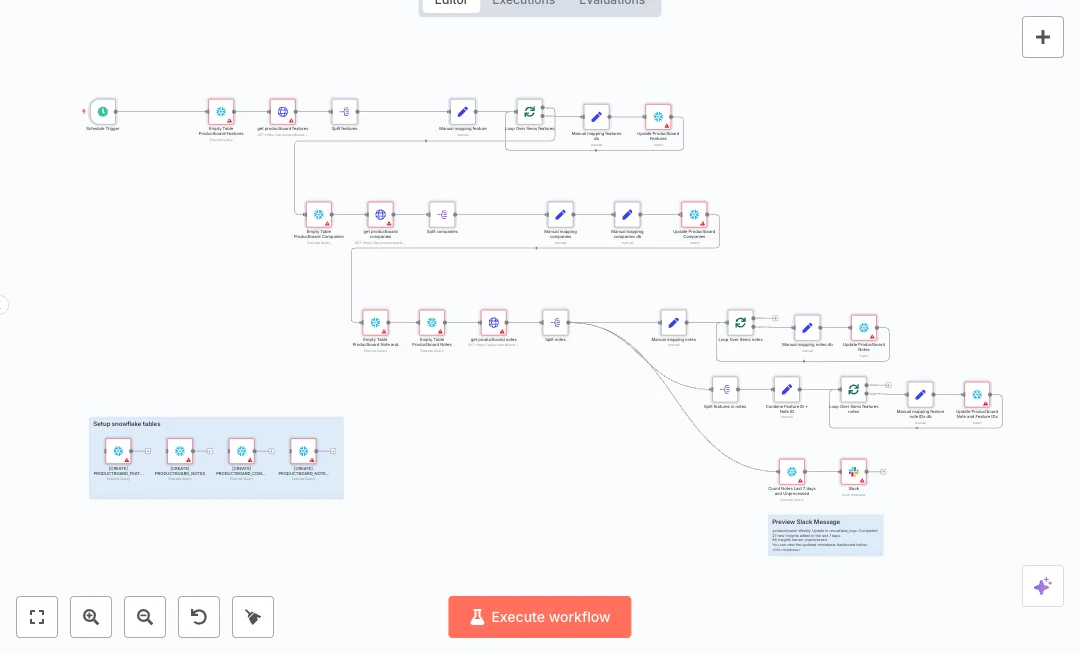 A schedule starts the run. HTTP calls fetch Productboard notes, features, and companies with pagination. Split nodes break large lists into single records, and Set nodes map clean fields. A join builds the link between notes and features so you can analyze relationships. Snowflake nodes create or clear the target tables, then write the latest data. A counter tallies notes from the last 7 days and those still unprocessed. Slack posts the summary with a link to your dashboard.