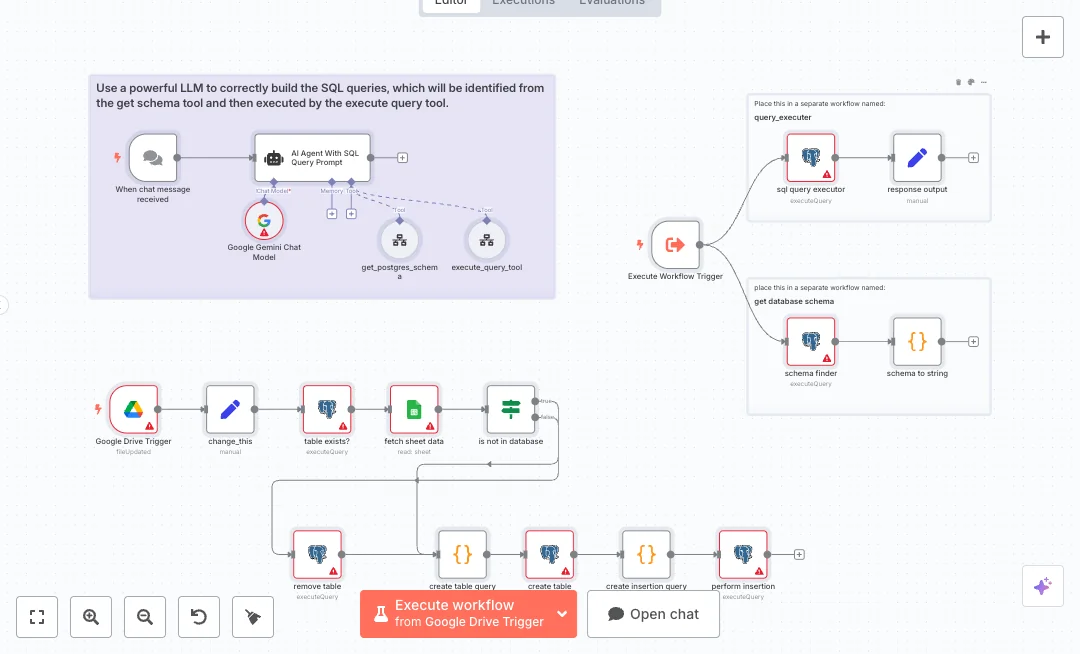 Here is how it works. A Google Drive event watches a specific spreadsheet. The flow pulls a selected tab, checks if the matching PostgreSQL table exists, then drops and rebuilds it with the right columns and types. Rows from the sheet are inserted with parameterized queries. A parallel chat path uses Google Gemini to read the database schema, write the right SQL, run it through a tool workflow, and return results. The mix of file monitoring, type-safe table creation, and AI query support cuts busywork and speeds decisions.