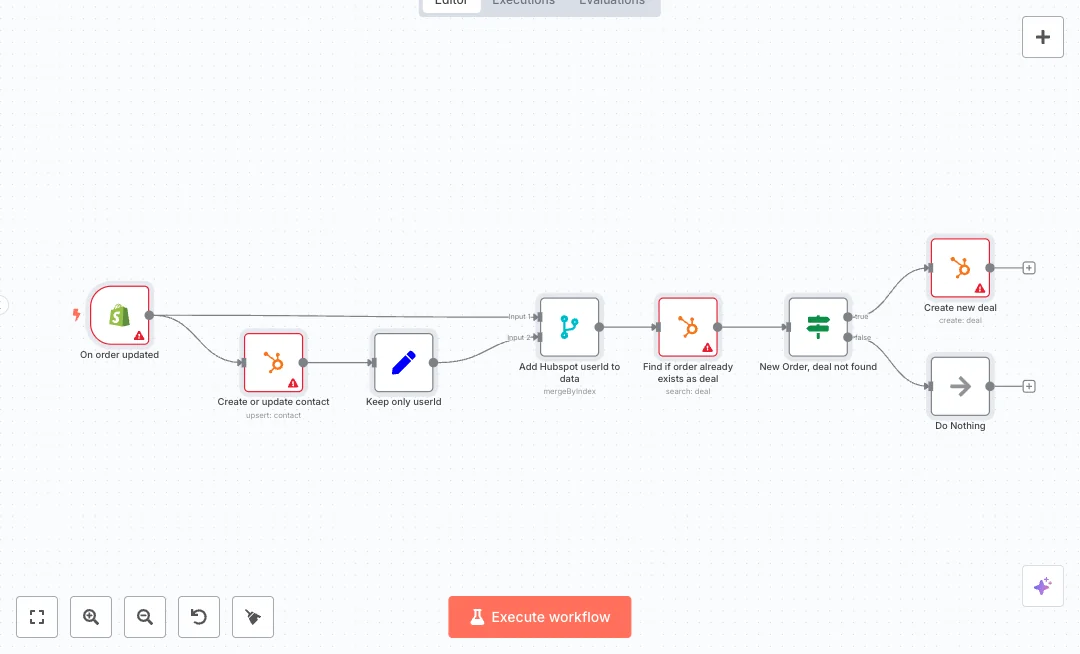 You need Shopify and HubSpot accounts and n8n Cloud access. Connect both tools, confirm the field mapping, and turn the workflow on so Shopify can send order updates to n8n. Expect faster reporting, fewer errors, and less data entry. Great for direct to consumer stores and small teams that want all sales in one place.