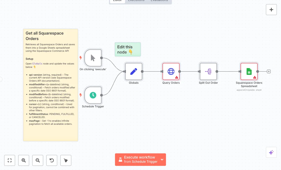 Runs by schedule or manual start, loads options from a Globals node, then calls the Squarespace Commerce Orders API. Filters like modifiedAfter, modifiedBefore, fulfillmentStatus, and cursor help pull only the data you need while paging through large histories. The Split Out Order node breaks the API result array into single records. Each record is written to a selected Google Sheet with append or update, mapping columns for Order ID, Email, Currency, Subtotal, Total, item counts, and timestamps.