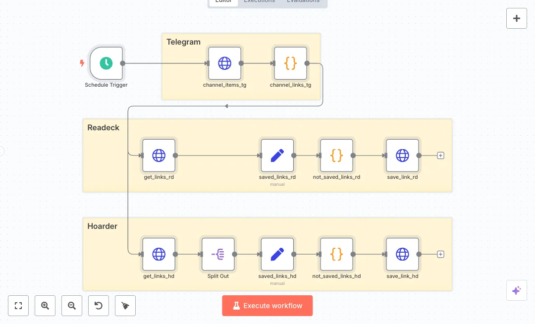 Capture new links from a Telegram channel and file them into two reading and bookmarking apps on a schedule. The flow checks what is already saved and only adds the missing links. This is helpful for content teams and researchers who share links in chat and want a clean, searchable library.