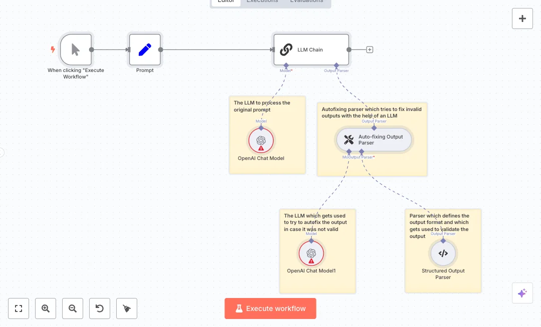 You click run to start. A Set node holds your prompt. An LLM Chain sends it to an OpenAI Chat Model set to zero temperature for stable answers. A Structured Output Parser defines the exact JSON schema the answer must follow. If the model strays from the schema, an Auto fixing Output Parser uses a second OpenAI model to repair the result and validate it again. The chain only passes data that matches the rules, which cuts manual rework and prevents bad records from entering your systems. This pattern is helpful when you want repeatable fields and values from AI.