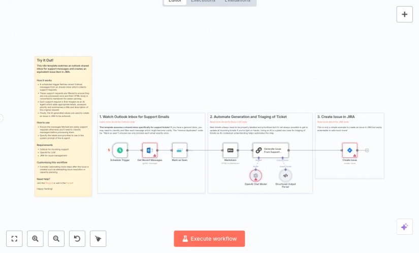 A schedule trigger checks the queue every few minutes and a mark as seen step stops repeat work. It pulls up to ten open items from your project with JQL. An AI model classifies each issue, sets a priority number, and rewrites the summary and description using a structured format, so fields are always clean. The system updates the ticket in Jira, then searches recent resolved issues with matching labels. For each match it collects the comments, lets AI summarise the real resolution, and bundles those notes into a final suggestion for the open ticket.