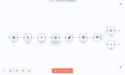 You need access to Twitter, MongoDB, PostgreSQL, Slack, and Google Cloud Natural Language. After connecting each account, set your keyword, channel, and database details. Expect less manual scanning and fewer errors, plus a clean dataset you can use for weekly insights and content planning. You can change the schedule, the search term, and the message format to fit your team workflow.